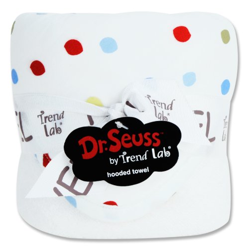 Trend Lab's Dr. Seuss One Fish Two Fish Hooded Towel will keep your baby warm and dry after bath time. The white terry towel features a cotton percale dot print throughout the hood and trim in avocado green, barn red, sunshine yellow, cornflower blue and powder blue. Hooded towel measures 32" x 30". Product sold under license from Dr. Seuss Enterprises, L.P.